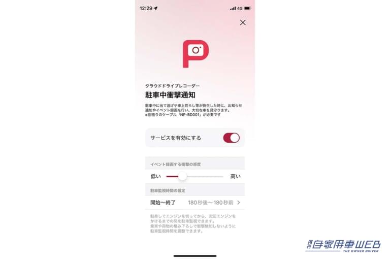 オプションには「駐車監視用電源ケーブル」を用意しており、これを接続するだけで駐車監視機能が実現。駐車中に車体に衝撃を受けるとサーバーへの映像保存と同時にスマホにも通知がなされ、クルマから離れた場所にいても何らかの異常が発生したことがわかる。