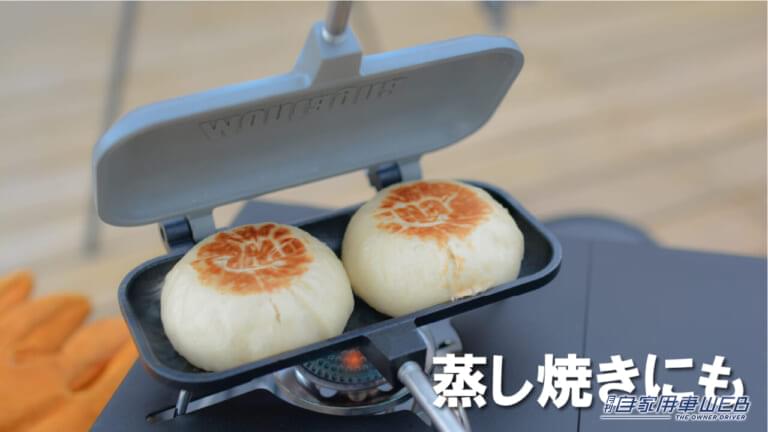 キャンプの定番、肉まんに焦げ目をつけたら蒸したりも可能だ。