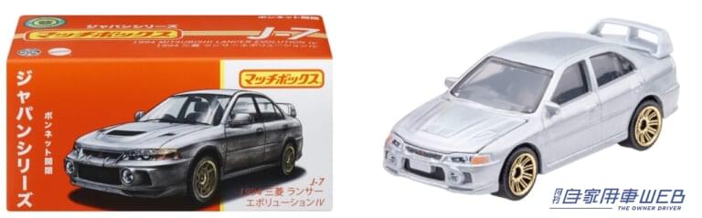1992年に小型セダンのランサーに、中型セダン、ギャランの最強モデルであるVR4用の2リッターターボとフルタイム4WDシステムを移植して生まれたランサーエボリューション(ランエボ)。マッチボックスでは第2世代のトップバッターとなったエボリューションIV(エボIV)を、ジャパンシリーズデビューの新金型でリリース。太いタイヤを履くために年々ボディが幅広くなっていくランエボの中では、エボIVは最後の5ナンバーサイズ(全幅1,700mm以下)車で、世界ラリー選手権で大活躍するなど現在も高い人気を博している。歴代ランエボの中でも最も生産台数が多いことで知られており、開閉式のエンジンフードを開けると赤いヘッドが特徴の4G63エンジンが確認できる。
