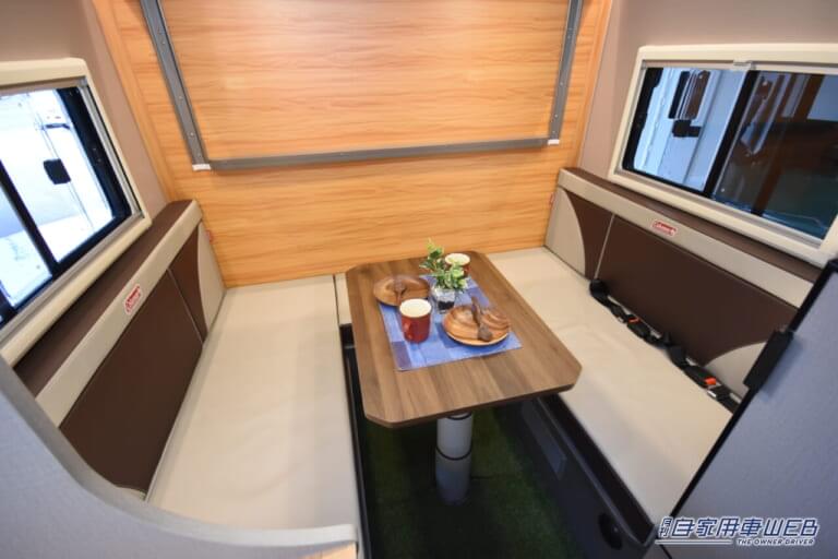 「Colemanモデル」では、シェル(居住部分)の外装に“Coleman”マークを配し、木や山々の風景がデザインされたラッピングが施され、実際の自然環境に溶け込めるような工夫がされている。また、ドアから室内に入ると大きなColemanのロゴ刺繍が目に入り、その上にはColemanのランタンが置かれ、内装はColemanのフラッグシップ「マスターシリーズ」の色調や風合いを再現したシートやテーブルがその世界観を演出している。