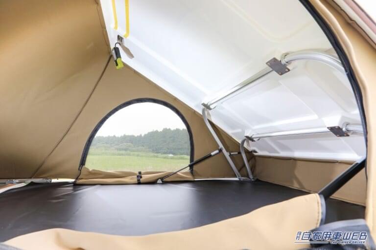 ジムニーは3ドアという構造上、室内空間が限られ、天井の前後長も短い。そのため、後端部を折りたたみ展開方式にすることで身長180cmの人でも足を延ばして就寝することができる。