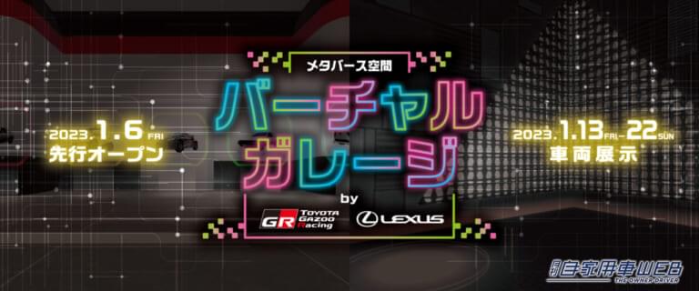 東京オートサロン2023をより多くの人に楽んでもらうよう、日本最大級のメタバースプラットフォームcluster上で、「バーチャルガレージby TGR/LEXUS」を開催する。一部の出展車両の外観、内部構造、映像などを時間や混雑を気にせず自由に楽しめるほか、「お客参加型モータースポーツ未来会議」の実施を予定。来場した人にはログイン特典プレゼントも用意されている。バーチャル空間の一部は、1月6日に先行オープンし、車両展示は1月13日に開始する予定だ。