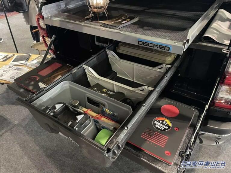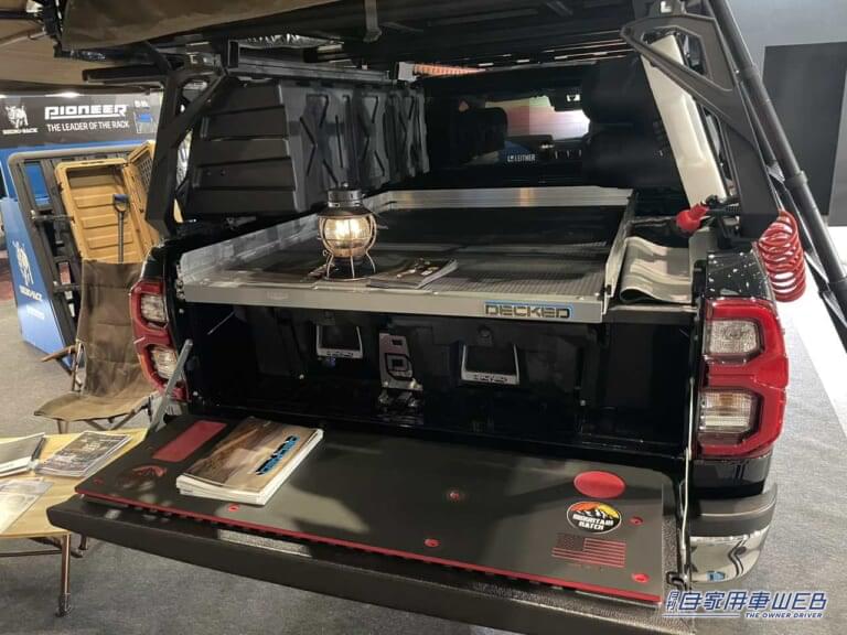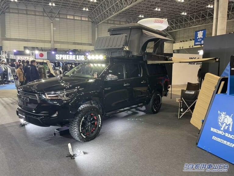 東京オートサロン2023の会場ではルーフテントを備えた車両が多く見られたが、その中でも特に大きく目立っていたのが、こちらのハイラックスだった。アメリカではフィッシングやハンティングのプロが愛用するカスタムだという。