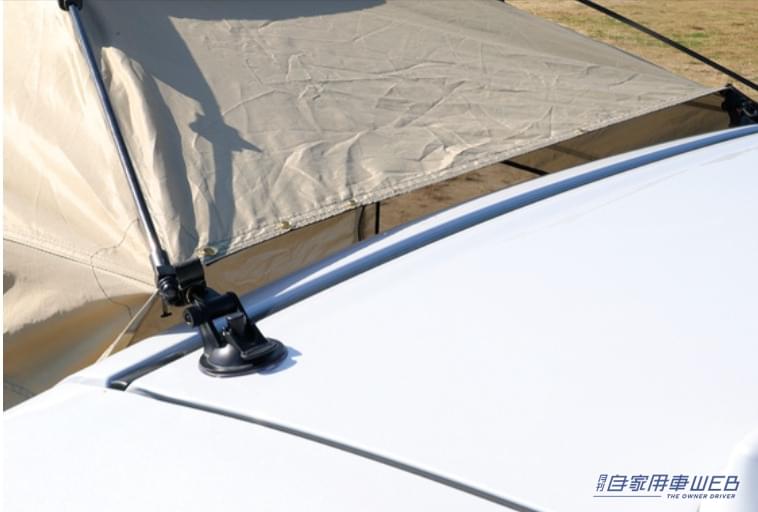 折り畳み傘のように広げれば、大きな力をかけなくとも約5分で簡単に設営でき、吸盤の取り付けなので、軽自動車から普通乗用車までさまざまな車体に対応する。