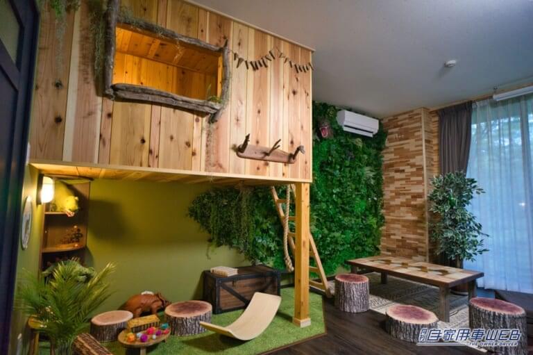 ファミリー限定客室の『HEYAmping BLUE』は子供のテンションが上がる部屋!部屋の中に秘密基地があり、ロープで登ったり、秘密基地のなかで寝ることも可能だ。壁には大迫力の恐竜がいたり、ぬいぐるみやおもちゃも用意されているので、部屋の中でも退屈することなく楽しく過ごせる。