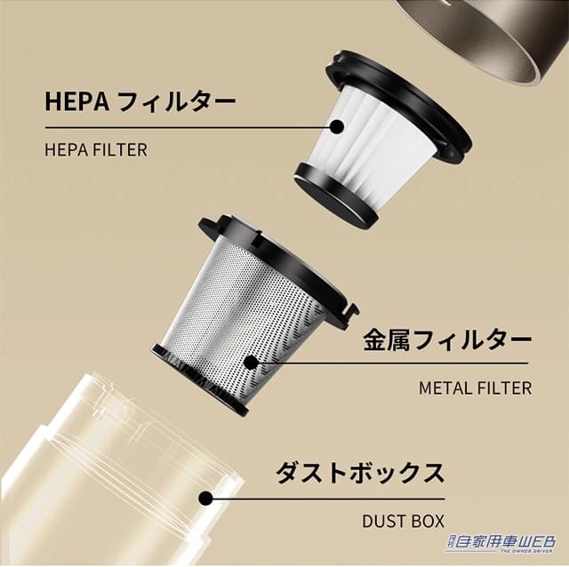 目に見えるゴミを捕まえる金属フィルターと、飛散ゴミやホコリなどの細かいゴミを捕まえるHEPAフィルターの二層構造!0.3μm以上の粒子を逃さず捕らえるぞ。