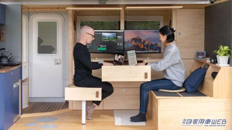 ノマドプロは車内のスペースを最大限に活用出来るよう、ドライブモード、オフィスモード、就寝モードの3モードを備えている。オフィスモードは、しっかり仕事に集中できるようにデュアルモニター設計。テーブルとベンチはキャビネット内に収納できる。キッチンは重厚感のあるウォールナットカウンターを使い、シンク、IHクッキングヒーター付きで調理も可能に。車内の角には木製のドアで仕切るプライベートシャワールームも施行した。