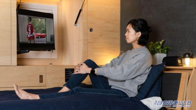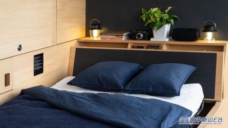 就寝時には折りたたみ式ベッドを取り出しベッドモードに展開可能だ。車内が柔らかいLED照明に照らされて、心地よいベッドルームとなる。