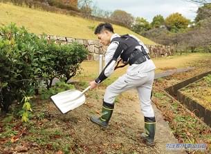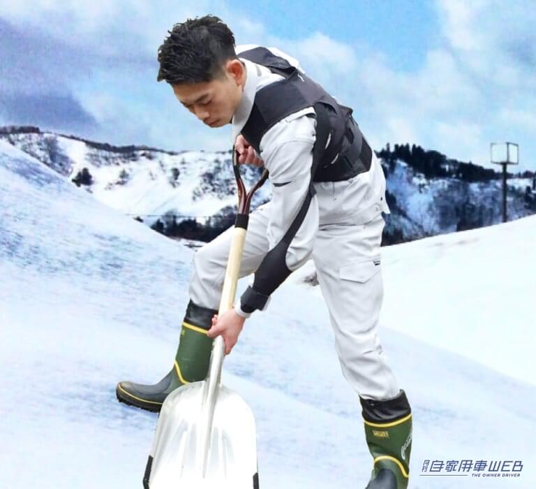 雪かきは腕や腰の負担が⼤きい作業。この問題を解決するため「DARWINGワーキングアシストAS」はスコップでの作業の負担軽減を図ることを目的に開発された、⾝体に密着したベスト型のアシストスーツだ。腰コルセット+腕サポートパーツが付随し、スコップでの作業時の腕を引き上げ、腰の安定により負荷を軽減する。