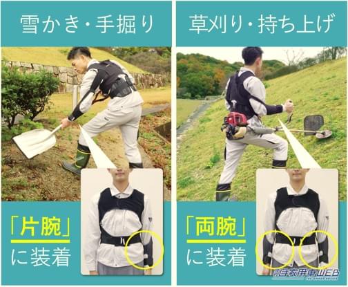 雪かきのように一方向にすくい上げてひねるような動作では、肩腕ベルトを片腕のみ装着し、雪を手押し車で運ぶ動作では両腕に装着することで機能を発揮。