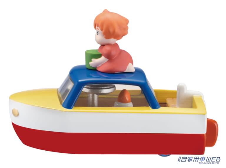 宗介のポンポン船と、それに乗るポニョをトミカで表現。劇中のポンポン船がそのまま手のひらサイズになったような、ミニチュア感がかわいい一台だ。ポンポン船は、動力となる船内のろうそくや管まで細かくリアルに再現。タイヤの色はクリアブルーで水面をイメージしている。劇中同様、ポニョは緑のバケツを手に屋根に乗り込んでいるのもポイント。