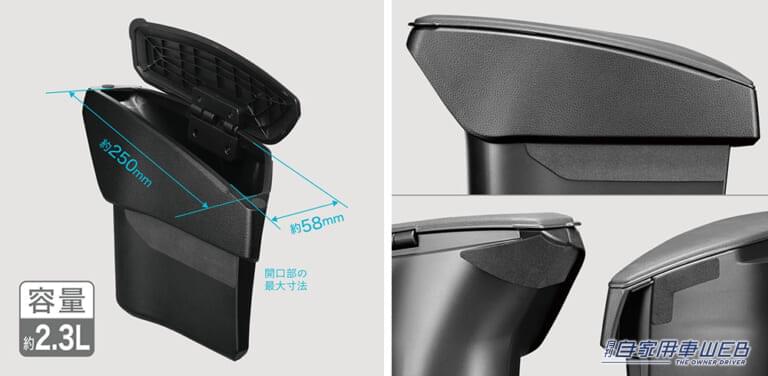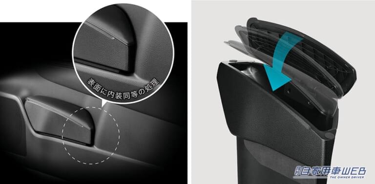 “まるで純正”かのような一体感を演出するため、ボディ表面にはクラウンの内装同等の革シボ処理を施し、手に触れる蓋部分はツヤを抑えた柔らかな感触のエラストマーを採用。さらにダンパーを内蔵し、蓋がゆっくりと静かに閉まる機構を取り入れている。