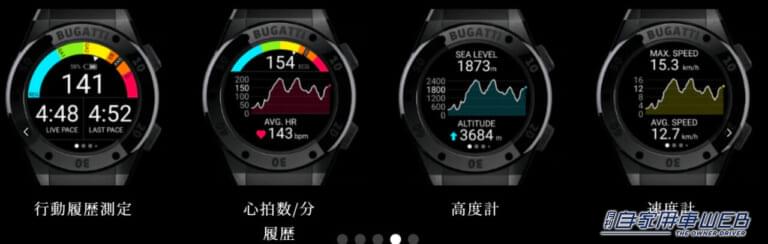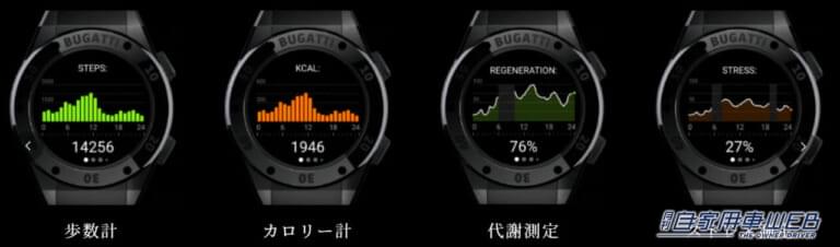 また健康管理に強いこだわりがあり、生体健康管理が出来るスマートウォッチの中でも初めてデュアル心拍センサー(心拍数を正確に測る2つのセンサーを内臓)を採用。これにより高精度な健康管理が可能となった。代謝測定、体年齢計、ストレス測定、水分損失測定、心拍数など健康機能を正確に測るために、1秒に10回追跡するGPSセンサー機能を搭載。「1秒間に10回計測するという、ここまで正確に機能性を備えたスマートウォッチは、世界中でもブガッティの他にないのでは」(株式会社クラウド・マーケティング 代表、増井 実津治)と、健康管理機能を利用されるスマートウォッチユーザーにとって秀逸なモデルだ。