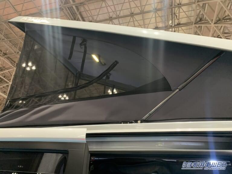 D:POP最大の特徴は、女性でも簡単に開閉操作ができる「ポップアップルーフ」だ。ルーフを上げれば車内でも立つことができ、家族4名程が就寝できるスペースを確保する。テントは断熱生地を使用しているので防寒対策も施され、また夏には断熱生地を外せば防虫ネットのみの風通しの良いルーフテントに早変わりするなど使い勝手も抜群。