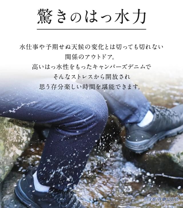 お気に入りの服でキャンプを楽しみたいけれど、焚き火の火の粉で焦げたり、雨や川の水で濡れたりと、ついつい服のことを気にしてしまうもの。せっかくのキャンプなのだから、火の粉で焦げたり水で濡れたりするのを気にせず、思う存分楽しみたい。そんな気持ちから生まれたのが、このキャンパーズデニムだ。