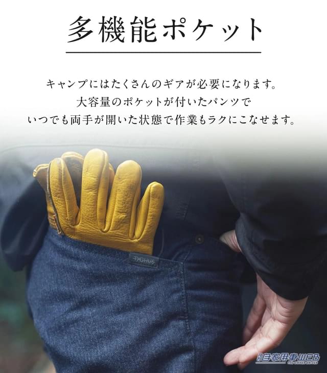 シルエットはスッキリとしたシンプルなデニムに見えつつも、実はバックポケットには深さ21cmもあるタイガス独自のガーデニングポケットを採用。スマホはもちろんのこと、焚き火で使うグローブやファイヤースターター、テントのペグなど大きめの物でも余裕で収納することが可能だ。もちろん、タイガス独自のガーデニングポケットが異様に目立つなどといったことがなく、街着としても違和感なく使える。