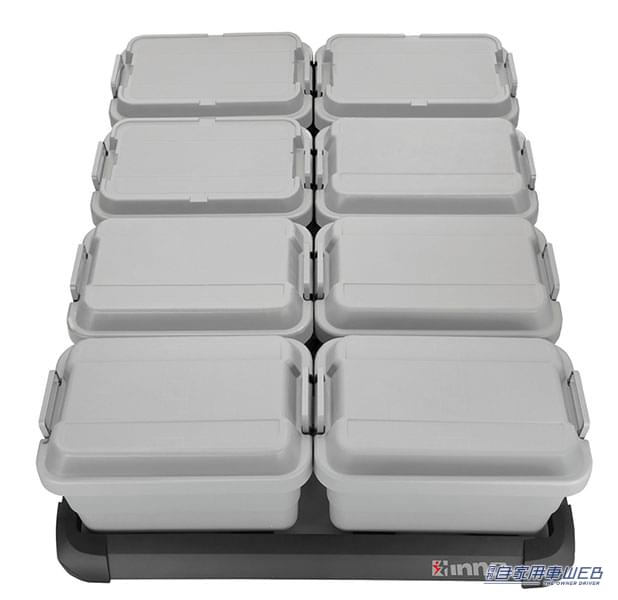 サイズアップによる加重がルーフへの負担にならないよう、更なる軽量化にこだわり設計(製品重量:約12㎏)。Mサイズのコンテナボックスが最大8個積載可能。