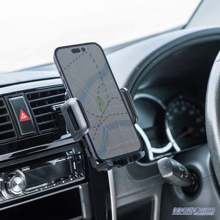 「CAR-HLD10BKN」は、クリップでエアコンのフィンを挟んでホルダーを取り付けることで、視界を遮ることなくスマートフォンを車載ナビや音楽プレーヤー代わりに活用できる。
