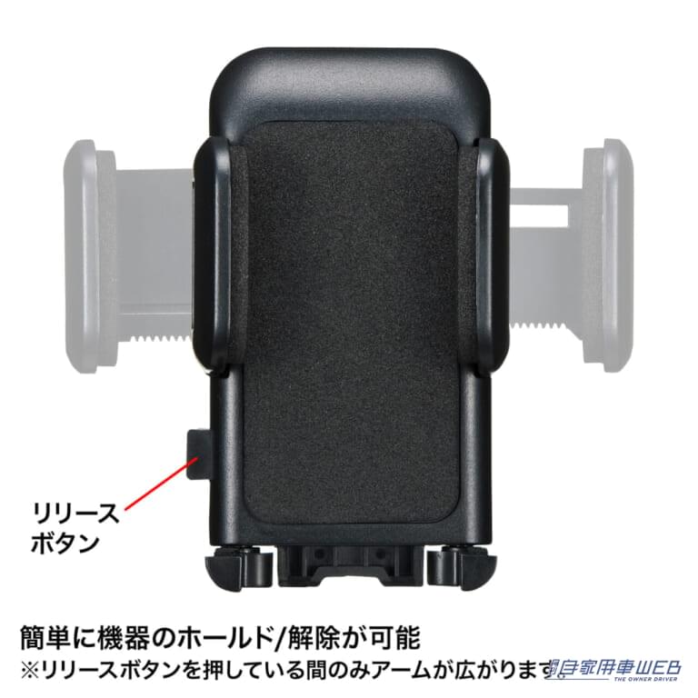 アームはワンプッシュで開閉し、機器を簡単にホールド、解除できる。