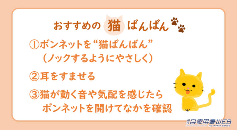 猫の命を守るためにも、乗車の前はボンネットなどエンジンルーム付近をやさしく叩くことを実践しよう。なお、ボンネットを叩くいわゆる“猫ばんばん”は有効だが、万能ではない。叩いて出てくるかは個猫差があるのだ。叩いたあと猫の声や気配を感じたらボンネットを開け、中まで確認しよう。