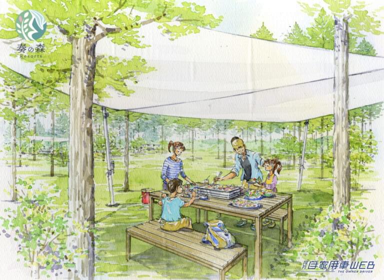 2023年秋にオープンを予定している「奏の森(かなでのもり)リゾート」は、国の天然記念物である大室山の至近に位置した森林にグランピングや少人数BBQも楽しめる「自然エリア」と、お買い物や飲食などを楽しめる「商業エリア」の2つからなる複合観光施設。