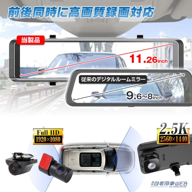迫力ある大画面で高画質なカメラ映像。フロントカメラ2K+リアカメラFullHDの前後同時高画質録画ができ、ドライブレコーダー機能付き。