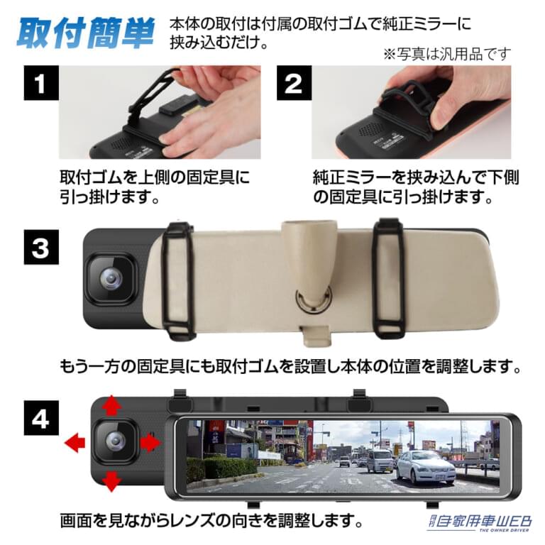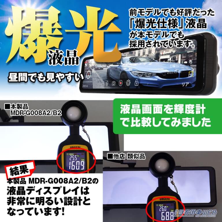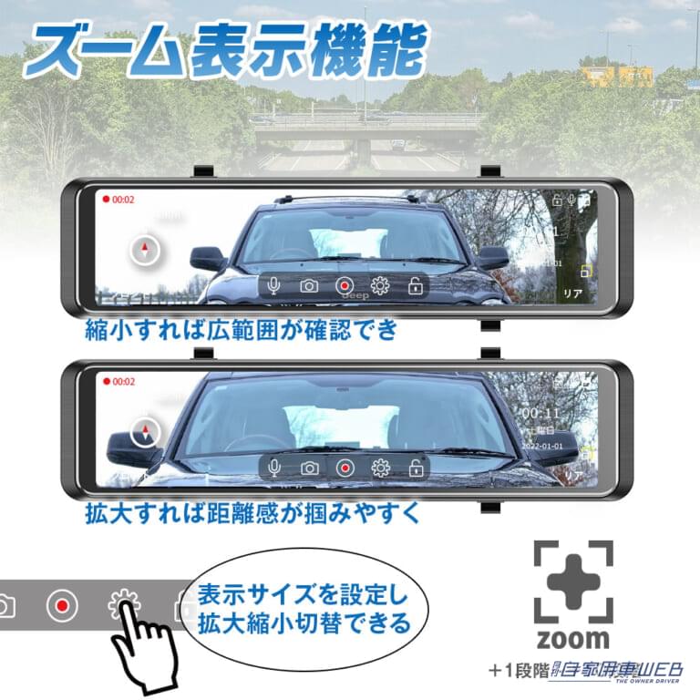 ミラー型ドライブレコーダー「MDR-G008A2」は、映像をズームすることでリアカメラの映像をミラーの距離感に近づける機能を搭載。前方カメラ一体型ミラーでカメラ位置は日本車向きの右側設定。自動ブレーキシステム搭載車でも視角の問題はない。