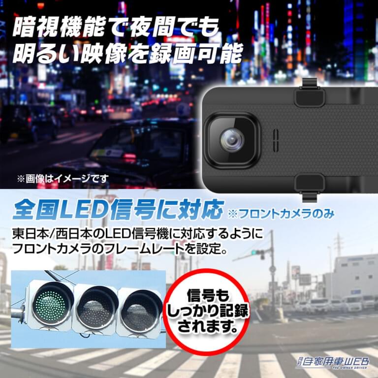 リアカメラは逆光に強いイメージセンサー(HDR対応)採用により明暗差を補正し鮮明できれいな映像を表示。悪天候時(雨や雪、霧、夜間の路面凍結)に視認性を高める。また、暗視機能付きで夜間は人間の目より認識でき、夜間の映像も鮮明に記録される。