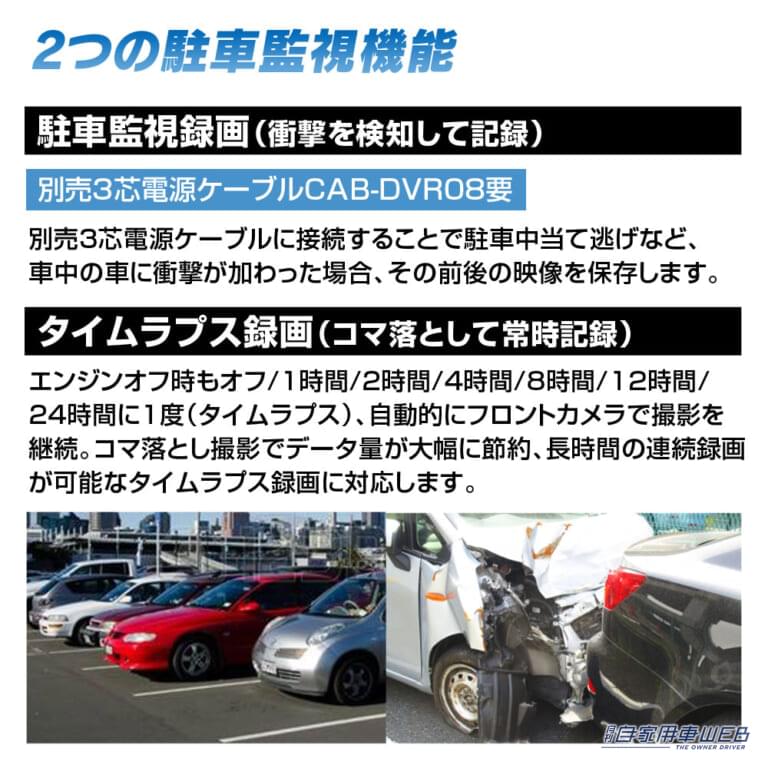 駐車監視ケーブル(※オプション)に接続すると、衝撃録画とタイムラプス録画の2つの駐車監視機能が設定可能。
