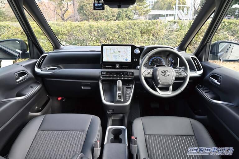 ミニバンならではのルーミーな車内。水平基調のインパネは物置トレイにとしても使いやすい形状。余計な装飾が省かれており、すっきりとした印象です。