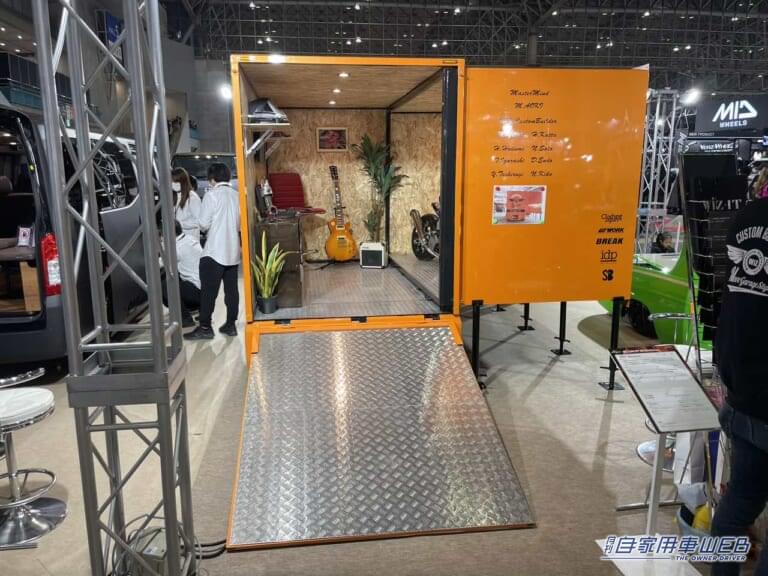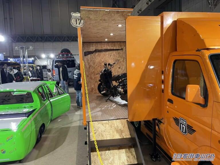 スズキのキャリイがベースとなっているこちらの車両。荷台の空間がそのままガレージになっている。荷台を二軸化し、スライドすると拡張できる仕組みだ。