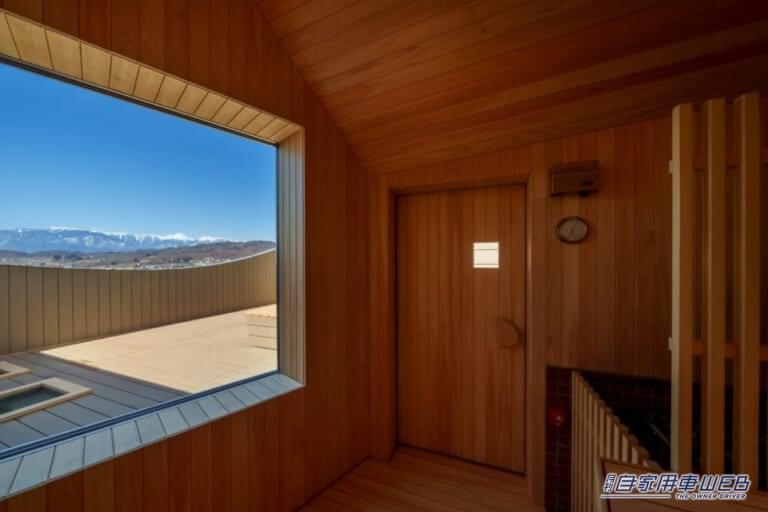 7階の大浴場からつながる屋上のサウナは、外壁の角度などを工夫し、大きな窓を設けることで、サウナの中から北アルプスの山並みを一望することができる。