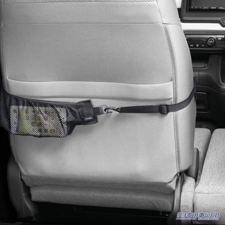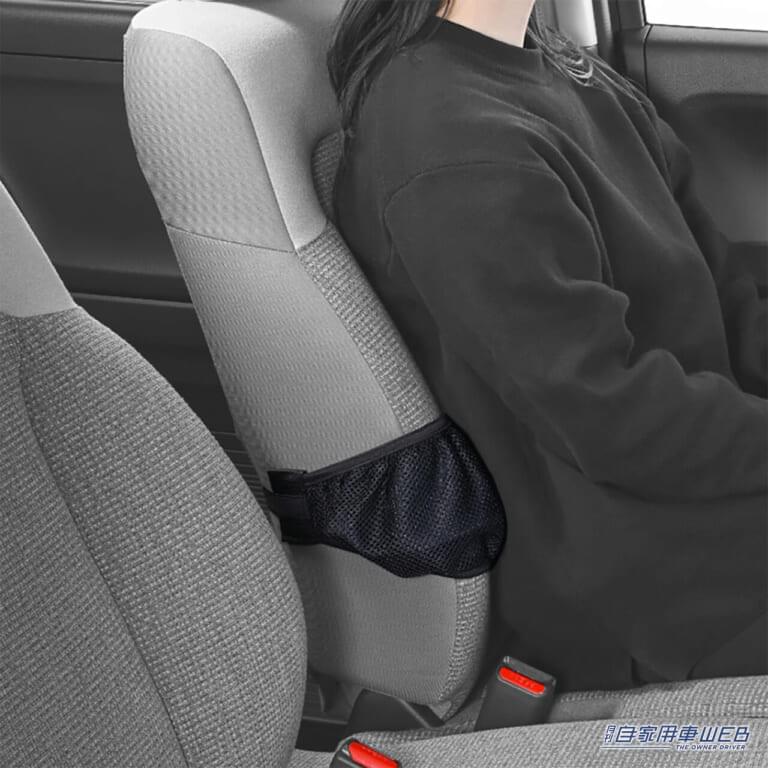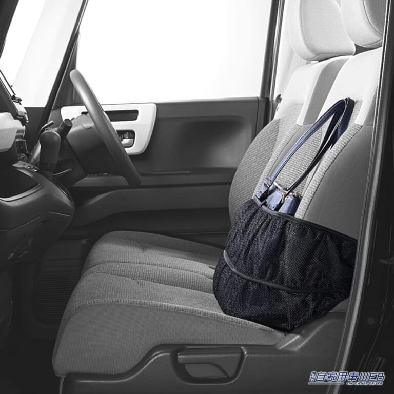 大きめな荷物からスマートフォンまで、幅広く座席に置いた荷物をホールドする。ブレーキを踏んだ際に荷崩れしづらいため、運転にも集中でき、事故の防止にも役立つ。また、背もたれに引き寄せながら固定するため、座面のシートベルトセンサーの誤作動を少なくする。
