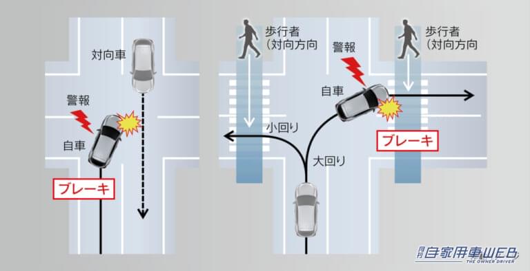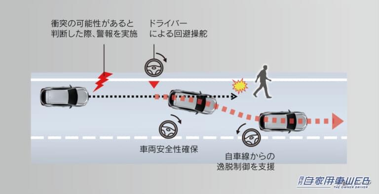 単眼カメラとミリ波レーダーの性能向上により、昼間の自転車運転者や夜間の歩行者も検知可能な「プリクラッシュセーフティ」の対応領域を拡大し、交差点右折前に前方から来る対向直進車や、右左折時に前方から来る横断歩行者も検知可能に。加えてドライバーの操舵をきっかけに車線内で操舵をアシストする緊急時操舵支援などの機能を追加。