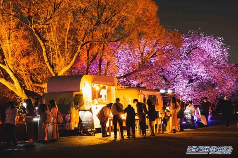 今回の取り組みでは、3年ぶりの実施となる新宿御苑の夜桜ライトアップイベントの一部演出にて、トヨタが開発した水素を使って走る燃料電池自動車「MIRAI」や、燃料電池バスと大小バッテリーをセットにした移動式発電・給電システムである「Moving e」による給電を活用。また、期間限定で昼間に開催予定のマルシェでは、人気レストラン「TREE by NAKED」が監修したお花見メニューを発電機を使わずに飲食の調理が可能な「FCキッチンカー」で提供。