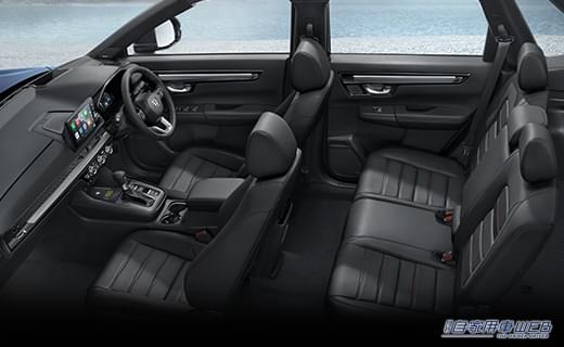 インテリアデザインは全世界で販売されるCR-Vと共通で、最上級モデルのe:HEV RS 4WDは、エクステリアと同じく特別仕様になっており、つや消しアルミニウムとピアノブラックのインテリアパッケージを装着。標準装備の本革シートや本革巻きステアリングには赤のステッチが入る。