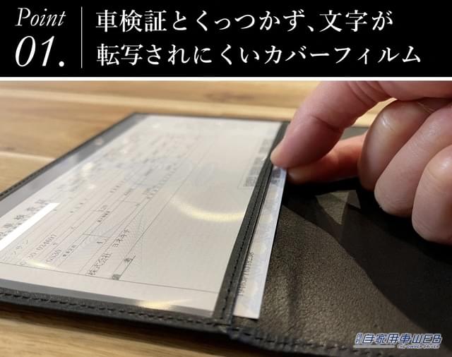 一般的な車検証ケースは、車検証とくっついて文字のインクがフィルムに転写してしまいがち。汚れたケースや取り出す際にパリパリ剥がすのは、あまりスマートな印象ではない。クラシカの車検証ケースはサラッとした手触り、インクや指紋のつきづらいマットフィルムを使用している。