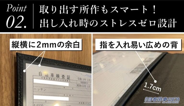出し入れの際に突っ掛かって車検証が折れたり傷ついたりすることのないよう、細部の設計に至るまでこだわった。ジャストサイズに収まりながらも出し入れがスムーズな車検証ケースに仕上げた。