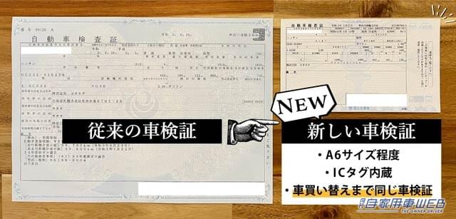 新しい様式の車検証は、A6サイズ程度の台紙にICタグ内蔵というものになる。従来台紙本体に記載されていた有効期限等の内容はICタグに記録されるため、電子記録を書き換えるだけで車検更新が済むようになった。そのため、これまで車検のたびに新しくなっていた車検証は、今後は一度交付されると車を買い換えるまで同じものを使うことになる。