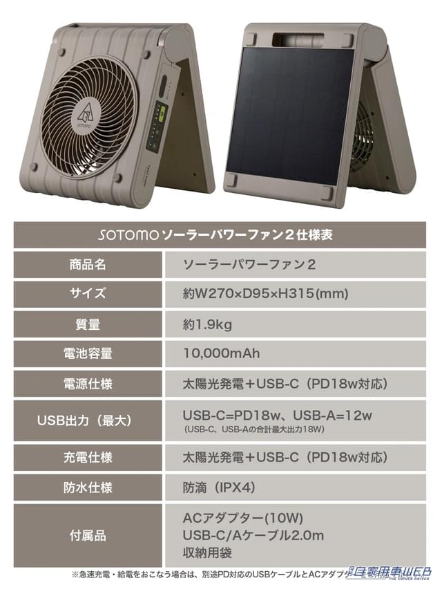 アピックスインターナショナルは、同社のブランド『SOTOMO』から「ソーラーパワーファン2(APF-570)」をリリースし、クラウドファンディングサイト「MAKUKE」にて販売している。
