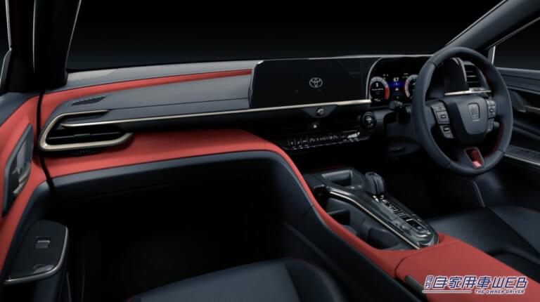 インパネまわりの造形は、エクステリアとは逆に「クラウンクロスオーバー」とほとんど同じで、今回公開された映像や画像にはスポーティな赤いインテリアパネルを採用。シートやステアリングには赤いステッチがあしらわれている。