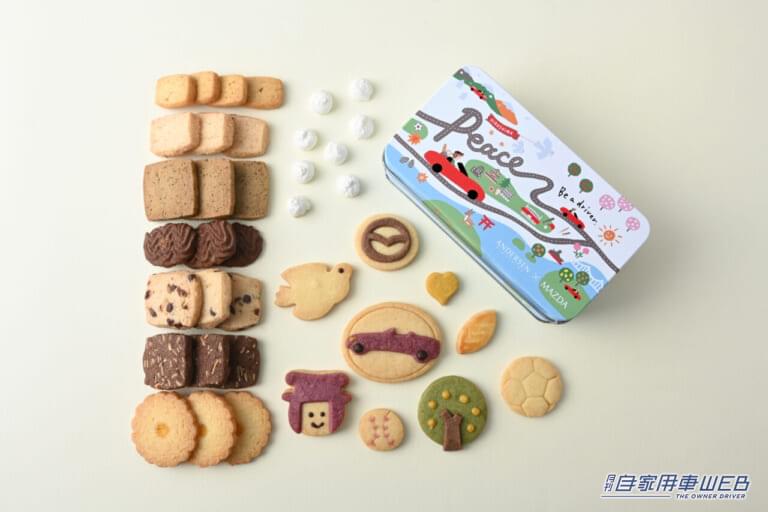 パッケージに描かれた「Peace」の文字から道が続き、広島の四季折々の風景の中をドライブするデザインだ。缶の中にも、鳥居やハト、柑橘の木、マツダロードスターなど、平和と広島を表現した特別なクッキーが詰まっている。