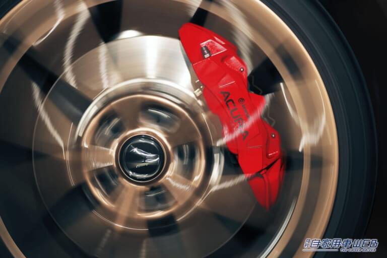 ブレーキシステムも320馬力を受け止めるべく、13.8 インチの大型 2 ピースフロントローターとブレンボ製4 ピストンモノブロックアルミニウムキャリパーを採用。タイヤサイズもノーマル「インテグラ」の235/40R18から265/30 R19へと大型化された。この大径タイヤを収めるべく、ブリスターフェンダーを装着し、全幅をノーマル「インテグラ」より約7㎝拡大。高性能化だけでなく存在感を高めるアイテムとなっている。