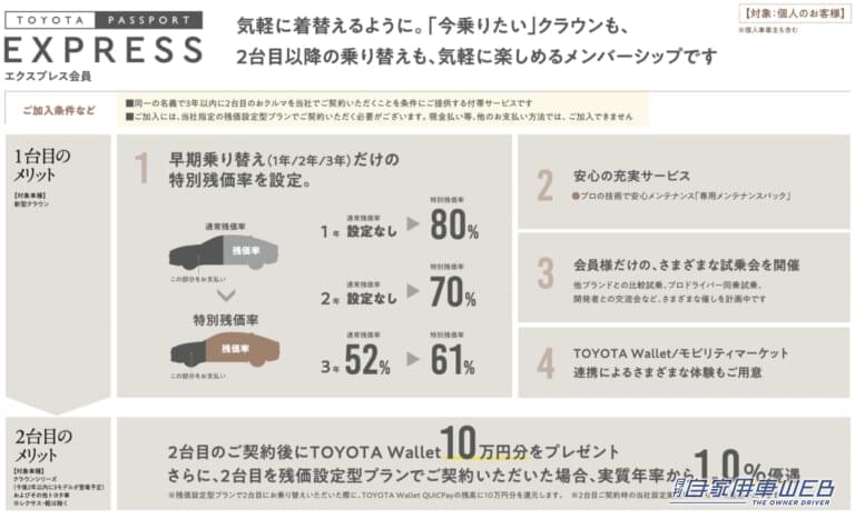 さらに、販社指定の早期乗り替えプランや条件でクルマを購入することで「エクスプレス会員」になることができ、特別残価率設定など数々の優遇措置が受けられるようになっている。
