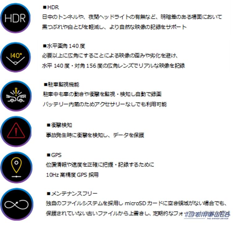 リアカメラ付属しており、後方からのあおり運転や追突事故などを記録。また手の平に収まる小さなサイズのため運転中の視界を妨げない。水平140度のレンズで後方の安全を守り続ける。