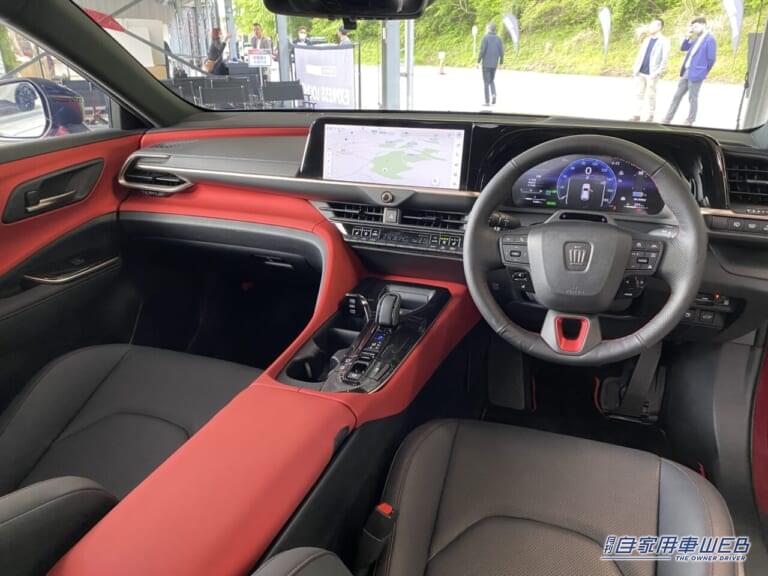 インテリアに関して宮崎満則氏は、「クラウンシリーズの美しさに赤黒のアクセントでスポーティ感を与えました。ステアリングやシフトノブ、スポーツシートに赤ステッチを採用し、高揚感を高める演出を行っています。」と説明した。