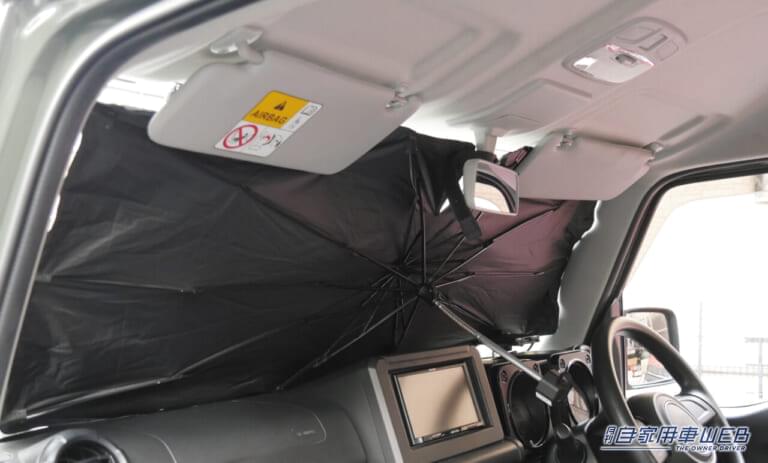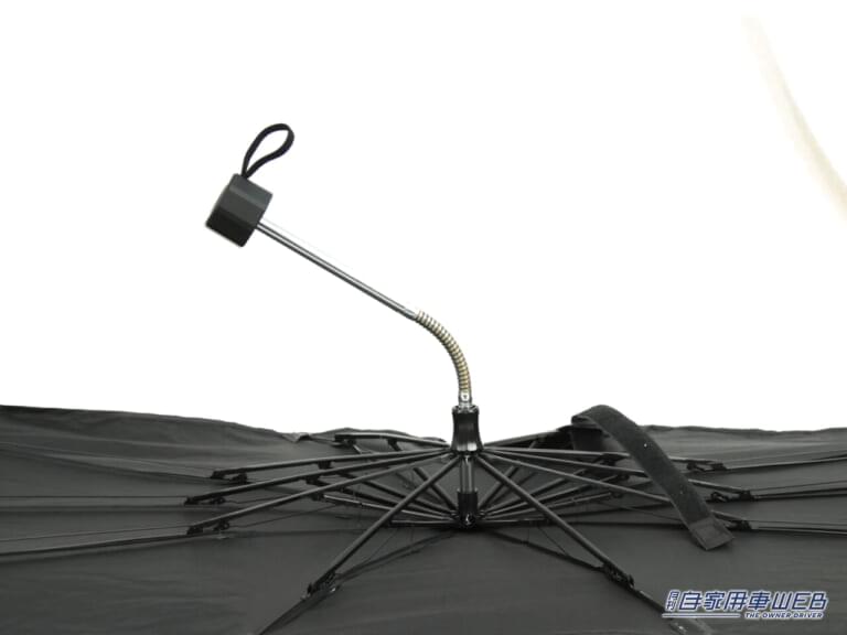 「EM-279 エマーソン 傘型シェードジムニー専用」は、折り畳み傘型にすることで収納性が向上。車内での収納場所に困らないサイズになる。また、チタンシルバーシェーディング生地を使用しているので、サンシェードに必要な遮熱・遮光性も高い。