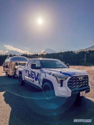 小林氏のこだわりは、利用するマシンを動かす電力にまで及ぶ。小林氏発案のもと、特別に開発された世界に2台しかない水素で走る燃料電池車のタンドラから供給された電気を使用し、自身のトレーラーを使ったおしゃれなカフェが、レース会場に出現。