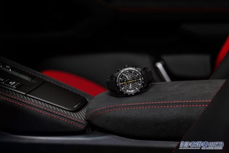 ポルシェ718スパイダーRSのオーナーのみが購入できるポルシェデザイン製クロノグラフも用意されている。これは、スイスのゾロトゥルンにあるポルシェ時計工房で製造された高品質時計で、車のデザインや技術的ディテールとも連動しており、ケースはチタン製、文字盤はカーボン製、ストラップはインテリアと同素材のレザーでできている。裏蓋は、718スパイダーRSのホイールリムのデザインとなる。