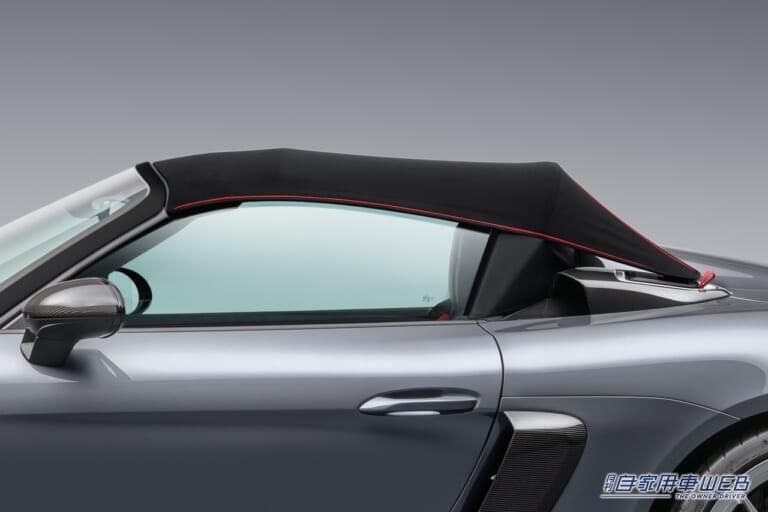 機械部品を含むルーフ全体の重量はわずか18.3kgで、718スパイダーよりも7.6kg軽く、718ボクスターと比較すると16.5kg軽くなっている。天候が許せば、トップを完全に取り外すことで、さらに8kgの軽量化が可能となる。